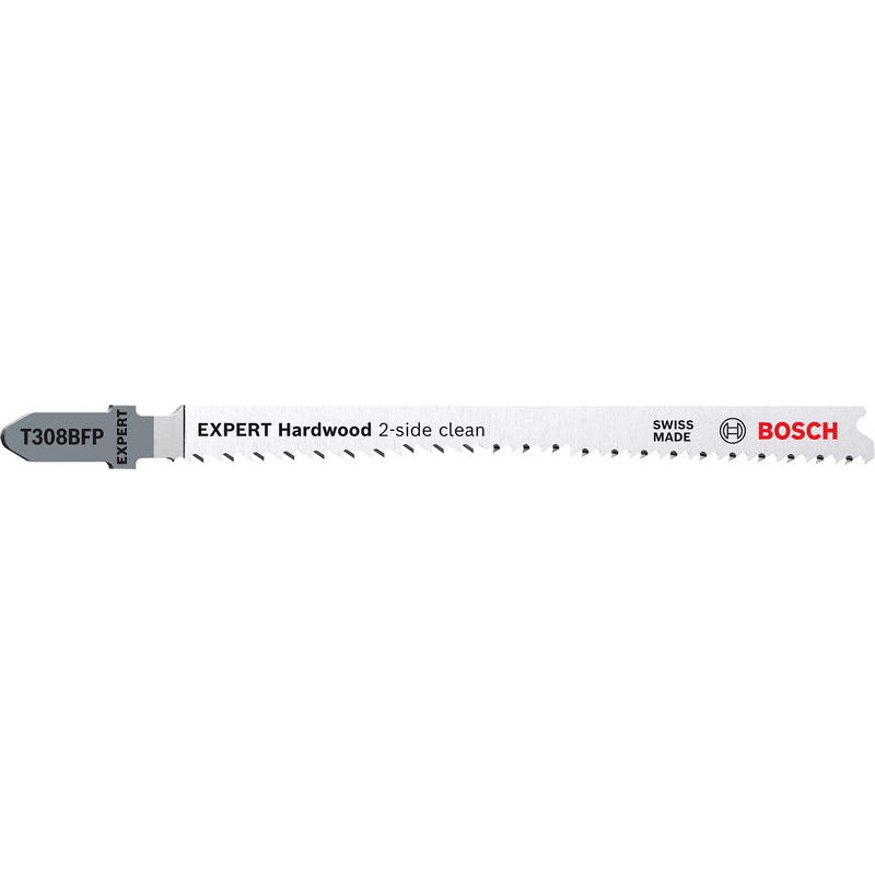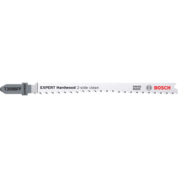 Hohe Präzision für ausrissfreies Schneiden von laminierten Arbeitsplatten! Bi-Metall Blatt: Kombiniert harte Zähne mit flexiblem Blattkörper Unter Tischlern und Schreinern war es schon immer eine Kunst sicherzustellen, dass der sichtbare Teil des Arbeitsmaterials die „saubere Seite“ eines Stichsägenschnitts zeigt. Manchmal muss man das Werkstück zum Sägen umdrehen. Oder die Stichsäge sägt von der Rückseite, um die gewünschte Schnittqualität auf der Sichtseite zu haben. Oder du verwendest das EXPERT Hardwood 2-side clean-Blatt, das dank seiner Zahngeometrie auf beiden Seiten einen perfekten, ausrissfreien Schnitt bietet. Hergestellt aus Bi-Metall – einer Leiste aus Schnellarbeitsstahl, die auf ein flexibles Stahlblatt geschweisst wird, um Festigkeit und Flexibilität zu kombinieren – ist das Bosch EXPERT Hardwood 2-side clean-Stichsägeblatt robust genug, um beschichtete Küchenplatten aus Grobspanplatten oder Hartholz zu schneiden. Erhältlich für ausrissfreie, gerade Schnitte (T308BF) und für besonders genaue ausrissfreie Winkelschnitte (T308BFP). Ausrissfreie Schnitte mit 2-side Clean Geometry