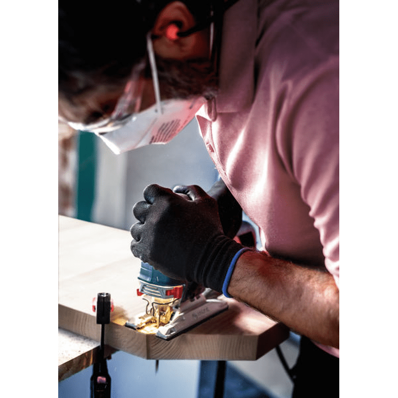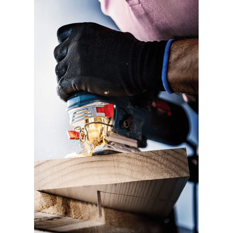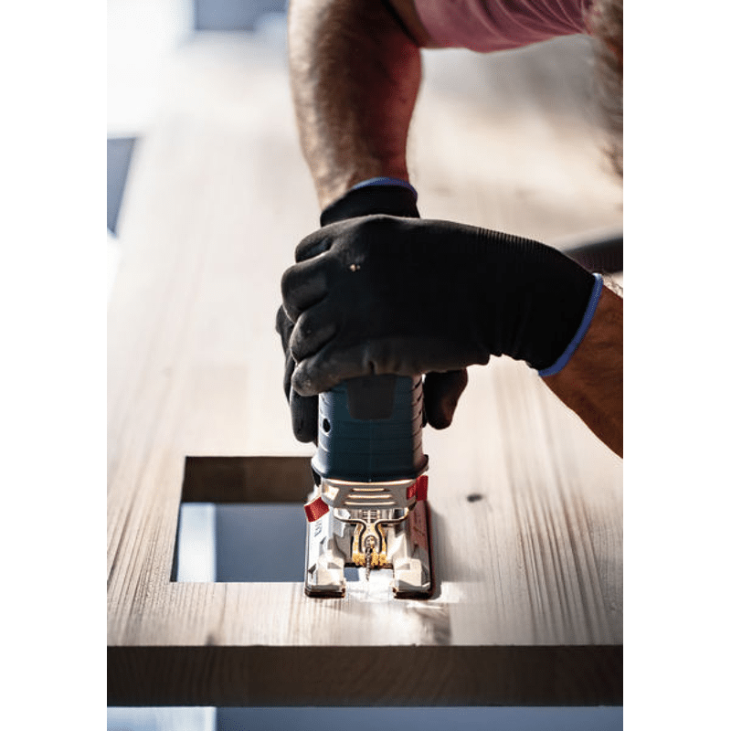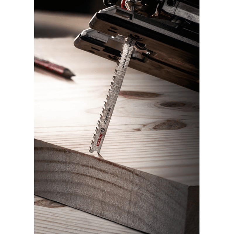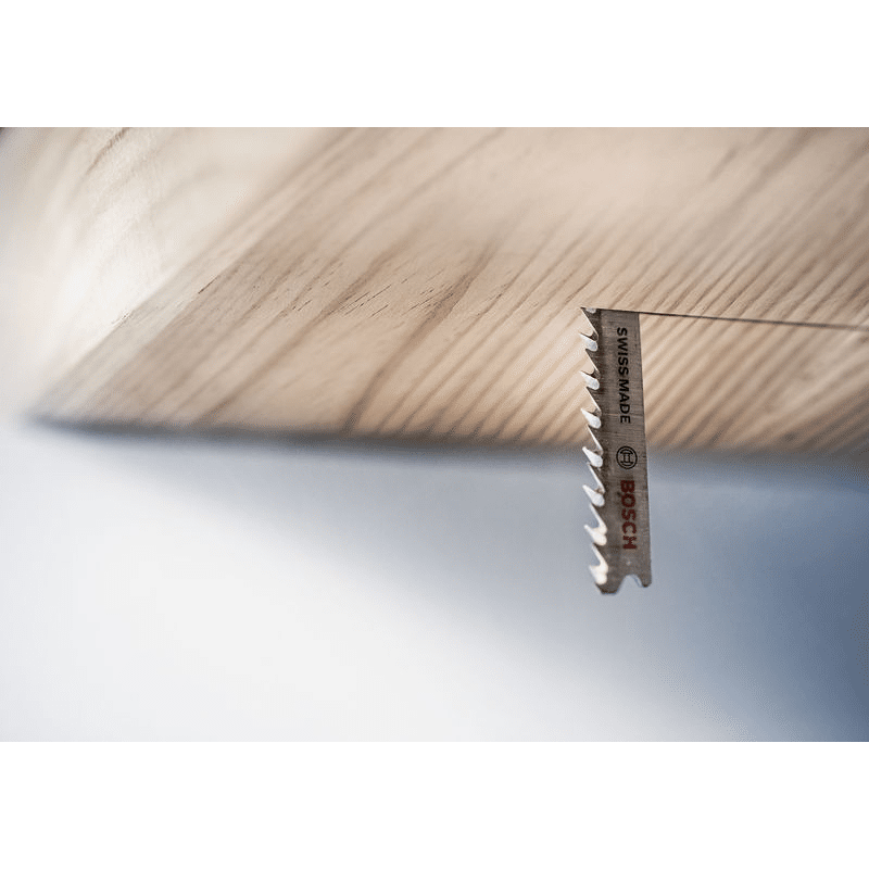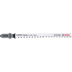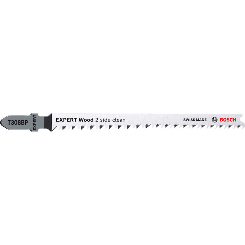 Hochpräzises, ausrissfreies Schneiden von Holz! Extrascharfe Zähne durch Präzisionsschliff Unter Tischlern und Schreinern war es schon immer eine Kunst sicherzustellen, dass der sichtbare Teil des Arbeitsmaterials die „saubere Seite“ eines Stichsägenschnitts zeigt. Manchmal muss man das Werkstück zum Sägen umdrehen. Oder die Stichsäge sägt von der Rückseite, um die gewünschte Schnittqualität auf der Sichtseite zu haben. Oder du verwendest das EXPERT Wood 2-side clean-Blatt, das dank seiner Zahngeometrie auf beiden Seiten einen perfekten, ausrissfreien Schnitt bietet. Mit seinen besonders scharfen, präzisionsgeschliffenen Zähnen eignet sich das Bosch EXPERT Wood 2-side clean-Stichsägeblatt gut zum Schneiden von Weichholz mit einer Dicke von bis zu 50 mm. Möbelschreiner können ein perfektes Ergebnis erzielen und verlieren nicht nach jedem Stichsägenschnitt Zeit durch Schleifen. Erhältlich für gerade Schnitte (T308B), für Kurvenschnitte (T308BO) und für genaue Winkelschnitte (T308BP). Ausrissfreie Schnitte mit 2-side Clean Geometry