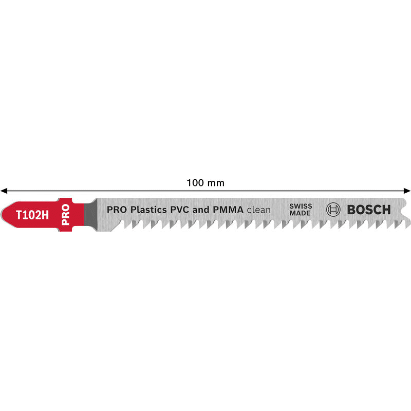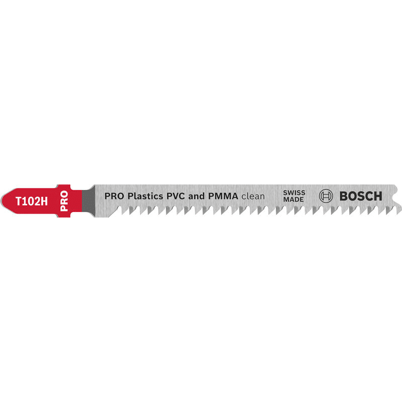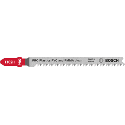 Präzises Schneiden von Kunststoffen! Konisch geschliffener Blattkörper für feine, saubere Schnitte Zum Schneiden von thermoplastischem Material ist ein scharfes und effizientes Stichsägeblatt erforderlich, das die Wärmeentwicklung reduziert und ein Schmelzen des Materials verhindert. Wir haben das PRO Plastics PVC and PMMA clean T102H entwickelt, um saubere Schnitte in thermoplastischen Platten, Rohren und Profilen zu ermöglichen.
