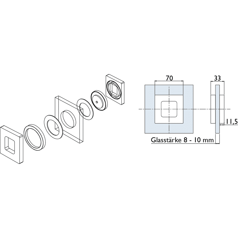 Der Lieferumfang der eckigen Glas-Schiebetürmuschel besteht aus der runden Glas-Schiebetürmuschel S65ER inkl. eckigem Cover. Dieses wird lediglich aufgesteckt.